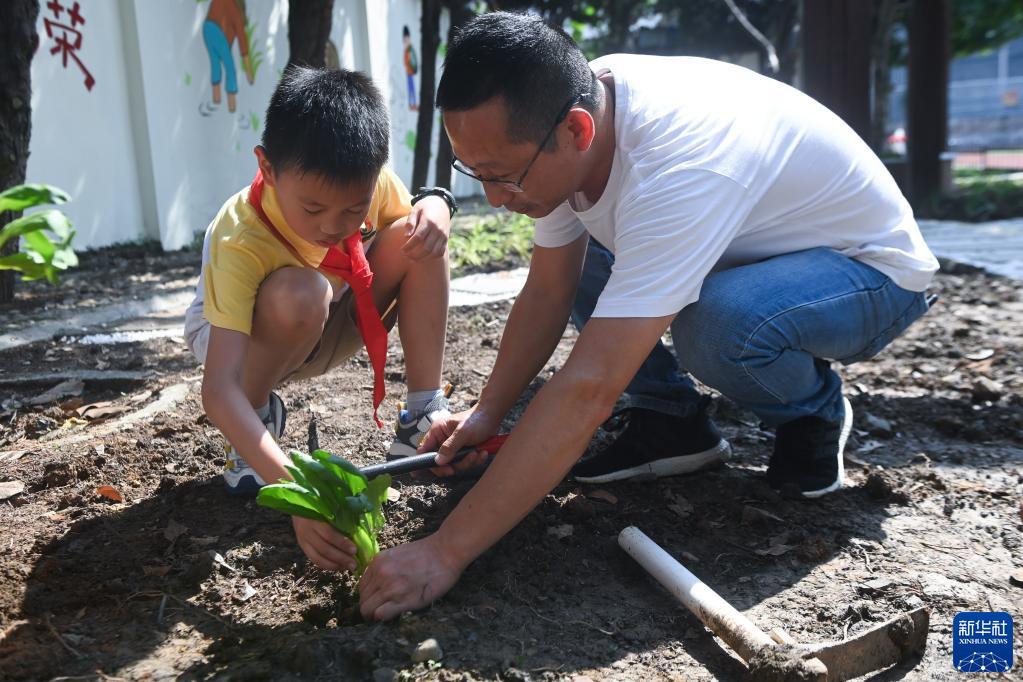 8月29日,龍泉小學(xué)老師帶領(lǐng)學(xué)生在校園里的“方圓農場(chǎng)”學(xué)習種菜。