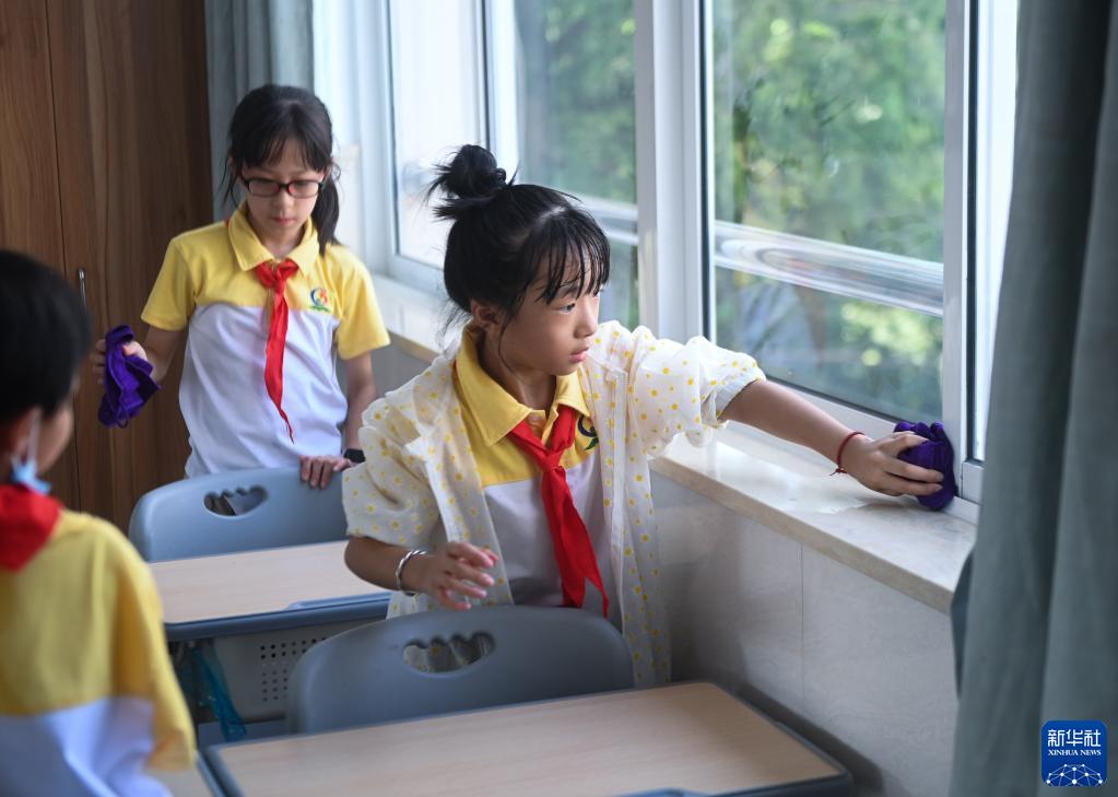 8月29日,龍泉小學(xué)的學(xué)生在打掃教室,開(kāi)啟新學(xué)期“開(kāi)學(xué)第一課”。