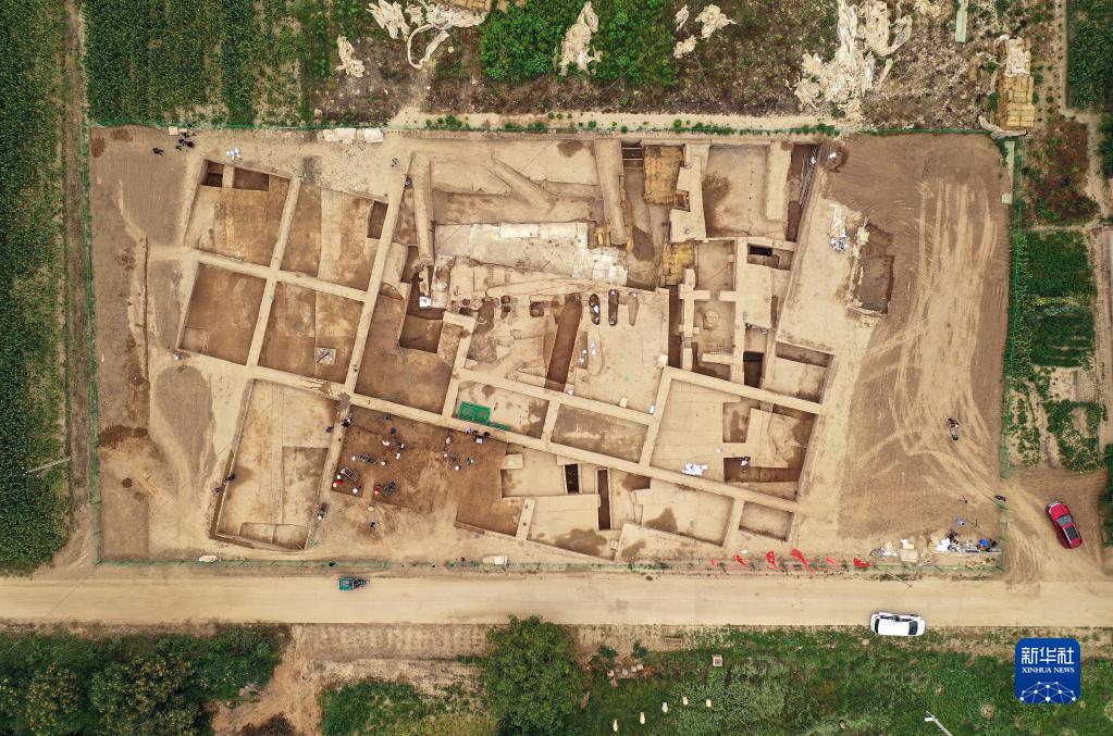 俯瞰南佐遺址核心區大型宮殿建筑發(fā)掘現場(chǎng)(8月23日攝,無(wú)人機照片)。