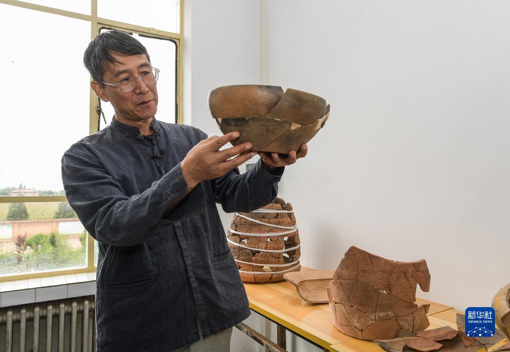 南佐遺址聯(lián)合考古隊領(lǐng)隊、中國人民大學(xué)歷史學(xué)院考古文博系教授韓建業(yè)在遺址研究基地內展示出土的陶器(8月23日攝)。