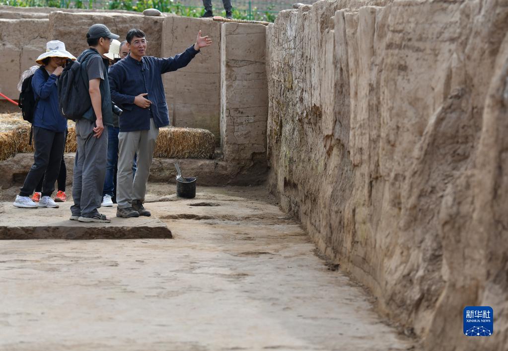 考古專(zhuān)家們在南佐遺址核心區大型宮殿建筑發(fā)掘現場(chǎng)考察(8月23日攝)。
