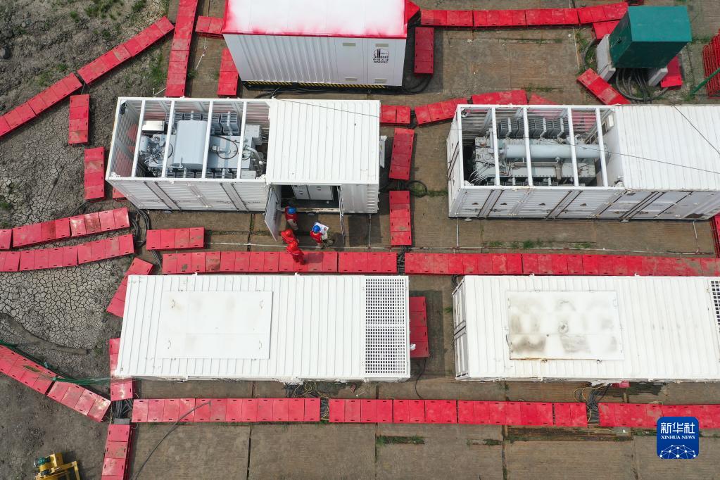 8月29日,在位于揚州市江都區的江蘇油田花頁(yè)5HF井電驅壓裂現場(chǎng),油田工作人員和電力工人在巡檢電力設備(無(wú)人機照片)。