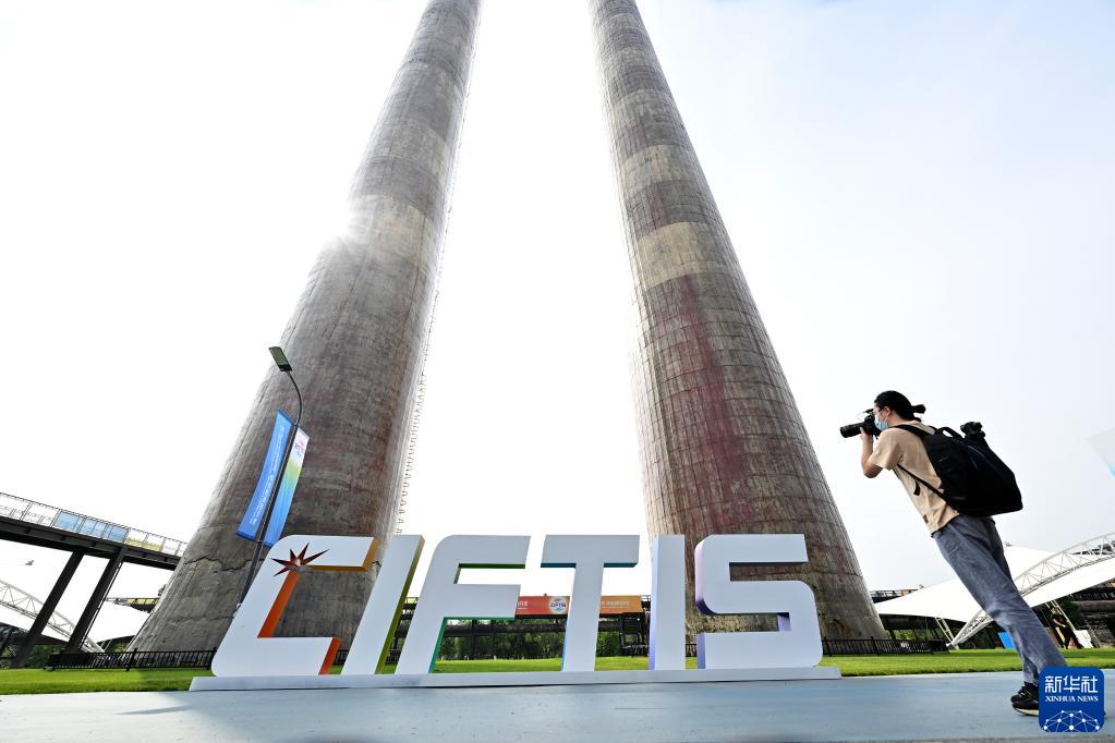 8月29日,參加探營(yíng)活動(dòng)的媒體記者在首鋼園區內拍攝服貿會(huì )標識。