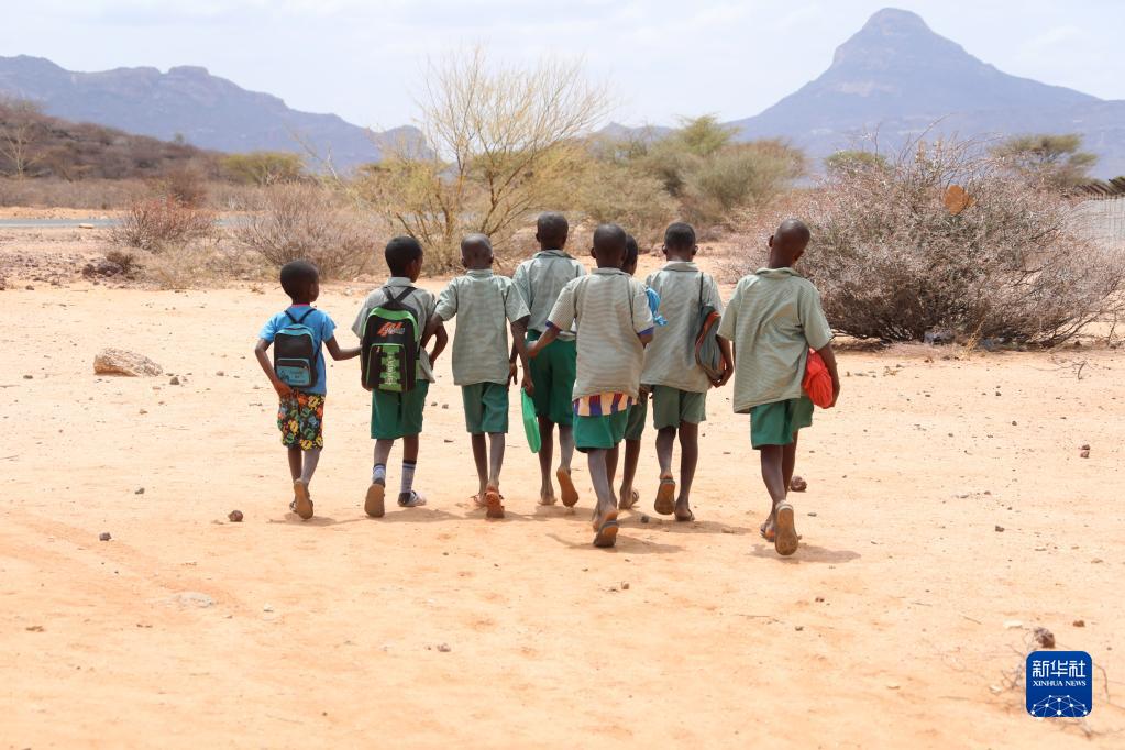 8月26日,在遭受旱災的肯尼亞馬薩比特郡萊薩米斯鎮,孩子們放學(xué)回家。他們從學(xué)?;丶倚枰叫?公里。
