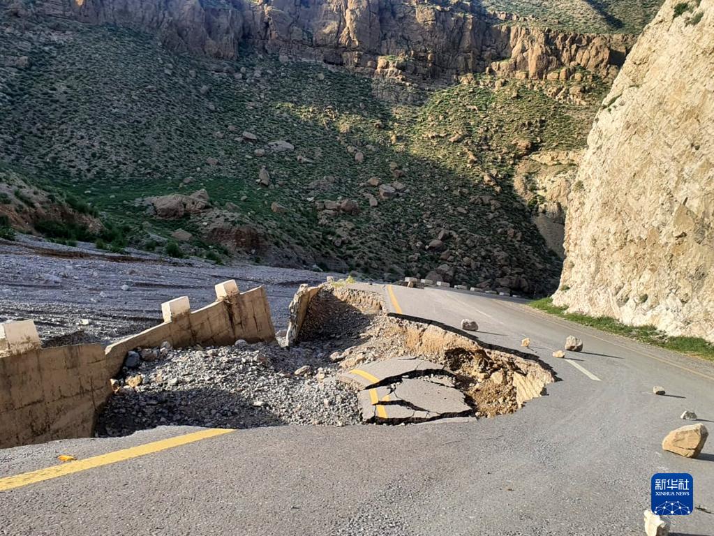這是8月28日在巴基斯坦俾路支省賈法拉巴德地區拍攝的被洪水損毀的公路。
