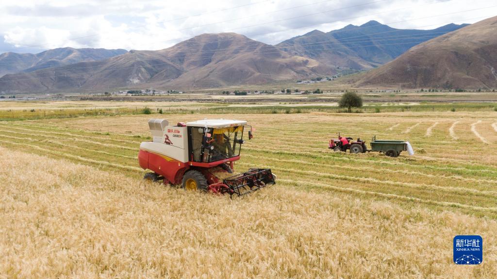 目前,西藏各地進(jìn)入秋收時(shí)節。西藏拉薩市墨竹工卡縣農民在積極防疫的同時(shí),抓緊收割青稞,確保顆粒歸倉。