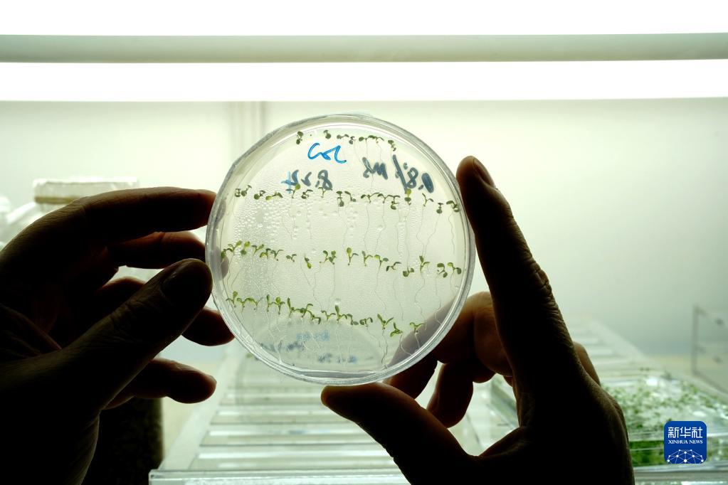 8月29日,在中國科學(xué)院分子植物科學(xué)卓越創(chuàng )新中心模擬微重力實(shí)驗室,鄭慧瓊研究員觀(guān)察擬南芥幼苗生長(cháng)情況。新華社記者 張建松 攝