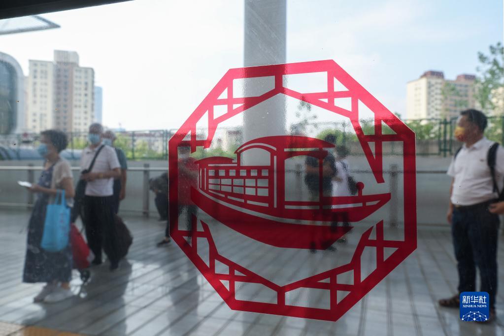8月30日,旅客在貼著(zhù)“南湖紅船”剪紙的Y701次旅游列車(chē)旁排隊候車(chē)。