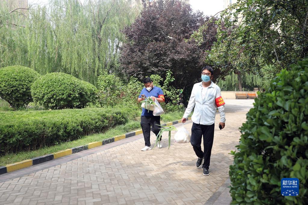 8月30日,在石家莊市眾美綠都小區,社區志愿者為社區居民送生活物資。