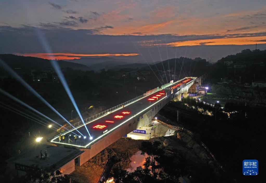 當日,廣西南(寧)玉(林)鐵路全線(xiàn)最大噸位雙幅轉體橋——福慶特大橋跨湘桂鐵路轉體橋在順時(shí)針旋轉后成功對接,兩幅對接后的轉體橋成為上跨湘桂鐵路的空中走廊,標志著(zhù)南玉鐵路建設取得重大突破。福慶特大橋全長(cháng)945米,轉體部分的橋梁梁體總長(cháng)220米,總重量超過(guò)1.2萬(wàn)噸。