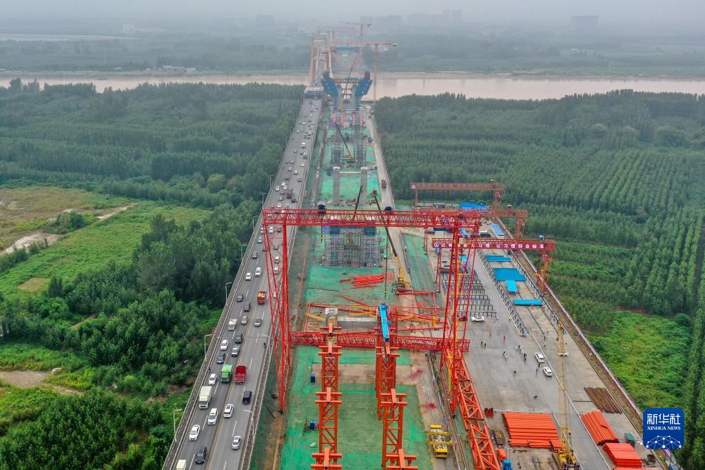 8月30日拍攝的濟南黃河公路大橋擴建工程施工現場(chǎng)(無(wú)人機照片)。