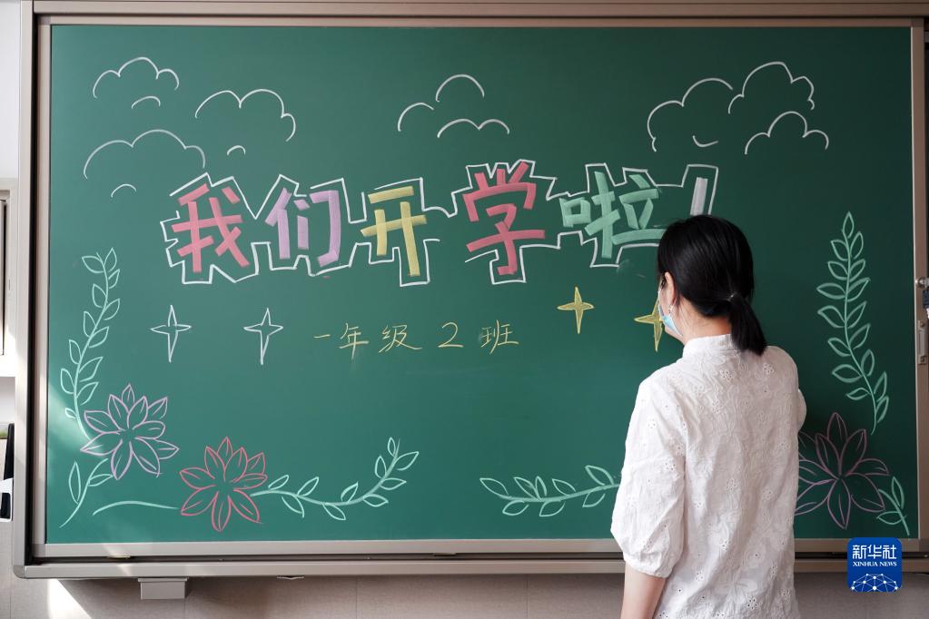 8月30日,人大附中實(shí)驗小學(xué)的老師在書(shū)寫(xiě)新學(xué)期黑板報。