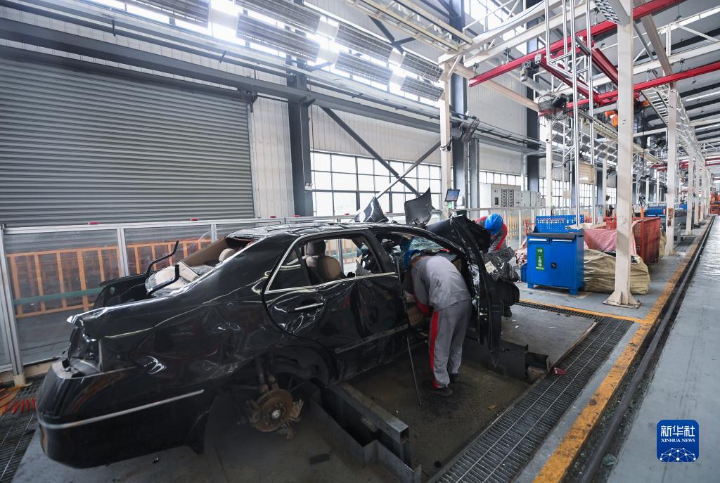 8月30日,在湖州市吳興區東林鎮一家機動(dòng)車(chē)回收拆解企業(yè)的車(chē)間內,工作人員在流水線(xiàn)上拆解機動(dòng)車(chē)的內飾。