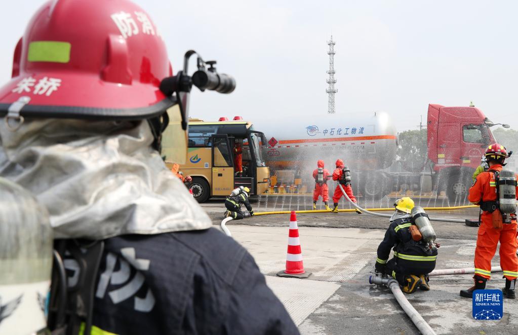 8月30日,消防救援人員在演練中對存在?;沸孤┑倪\輸車(chē)輛進(jìn)行水幕隔離作業(yè)。