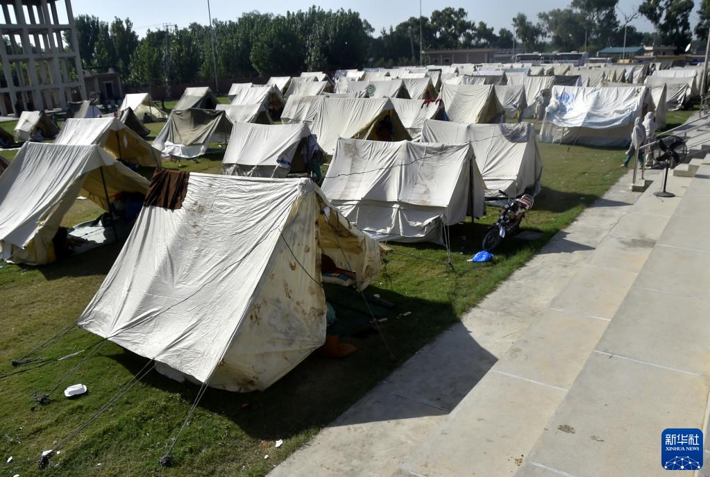 這是8月31日在巴基斯坦西北部開(kāi)伯爾-普什圖省的賈爾瑟達地區拍攝的救災帳篷。