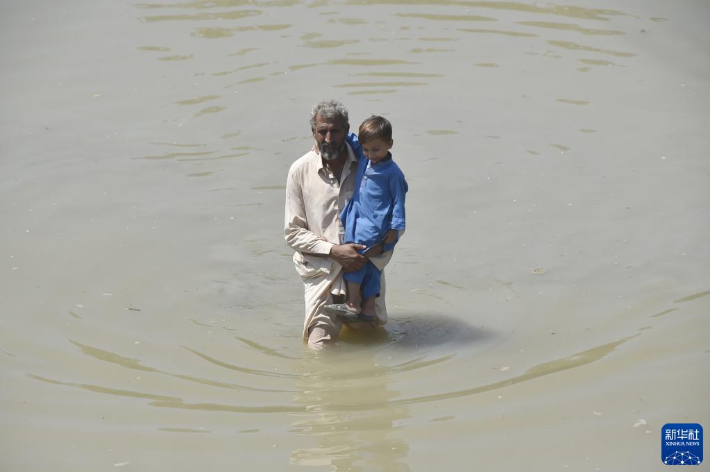 8月31日,在巴基斯坦西北部開(kāi)伯爾-普什圖省的賈爾瑟達地區,一名老人抱著(zhù)孩子走在洪水中。