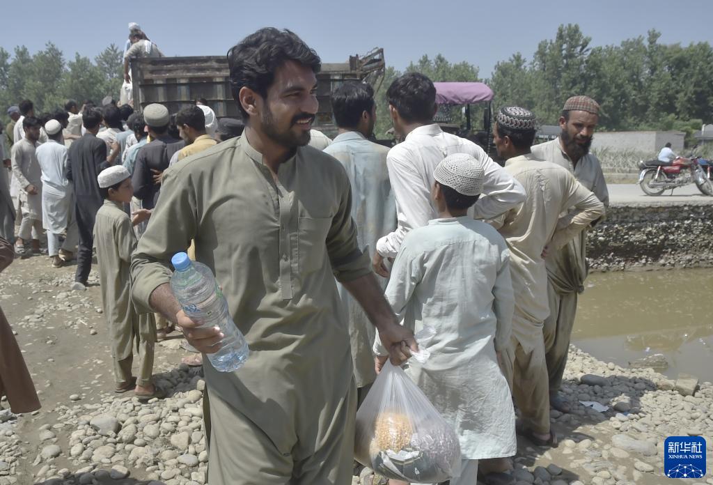 8月31日,在巴基斯坦西北部開(kāi)伯爾-普什圖省的賈爾瑟達地區,人們在領(lǐng)取救災物資。