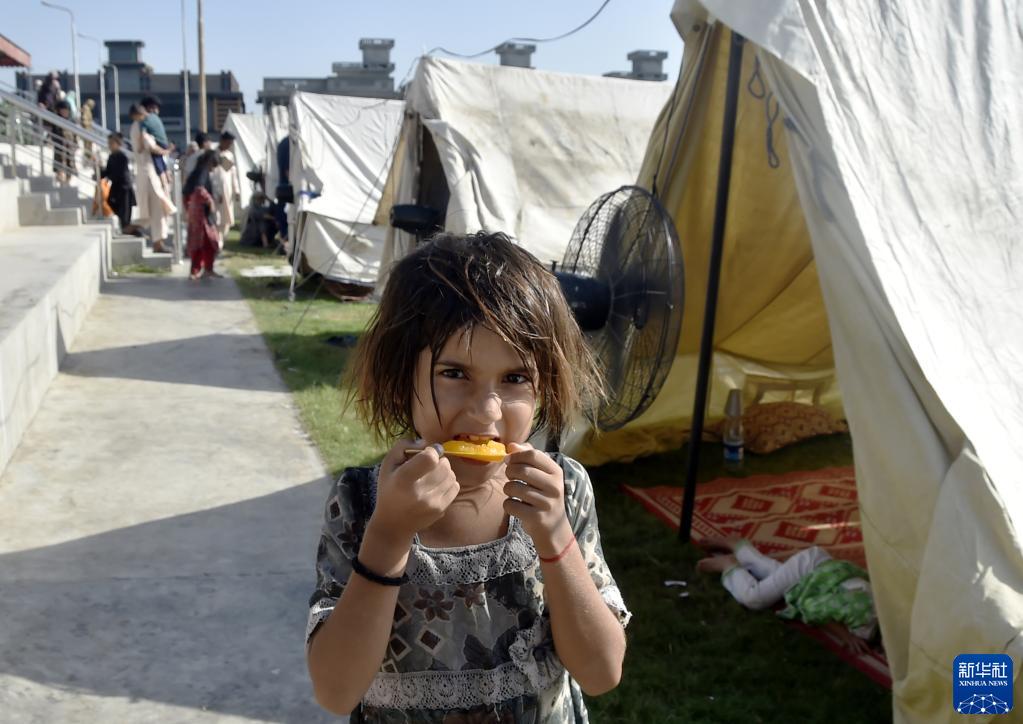 8月31日,在巴基斯坦西北部開(kāi)伯爾-普什圖省的賈爾瑟達地區,一名小女孩在救災帳篷外吃東西。
