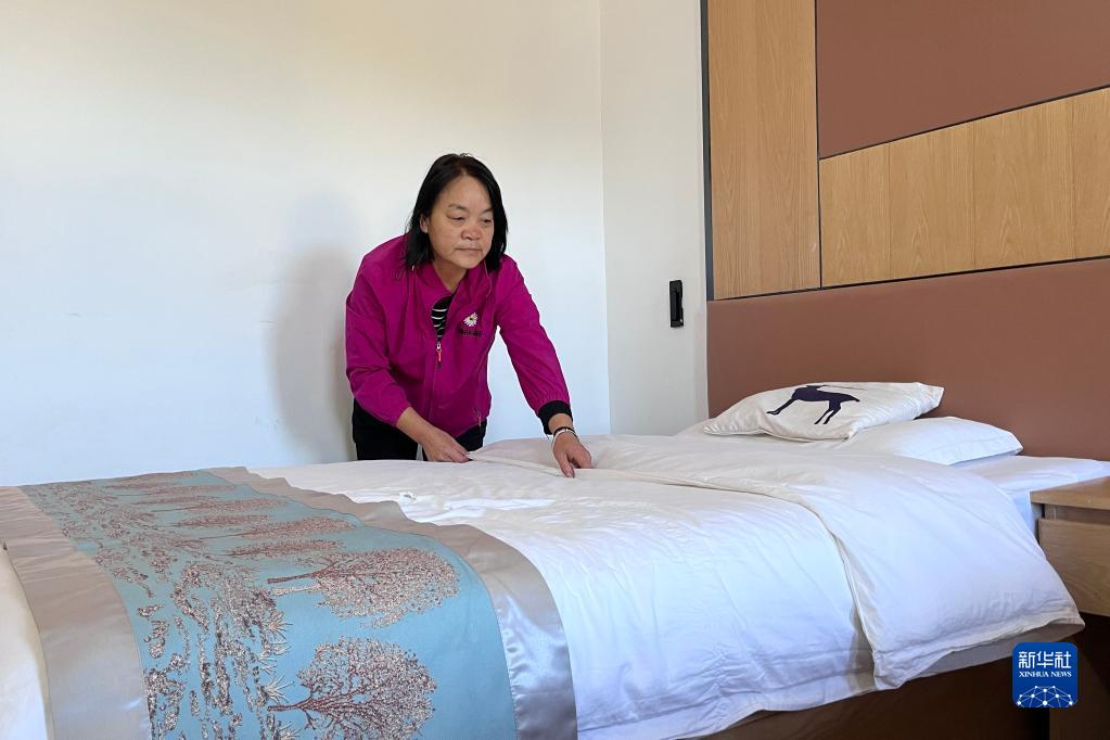 在黑龍江省漠河市北極鎮北紅村,張翠花在整理客房(8月27日攝)。