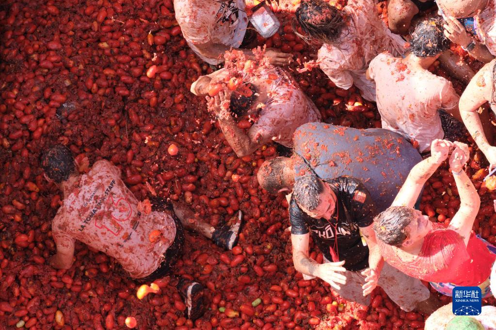 8月31日,在西班牙布尼奧爾舉行的“西紅柿節”上,人們參加“西紅柿大戰”。