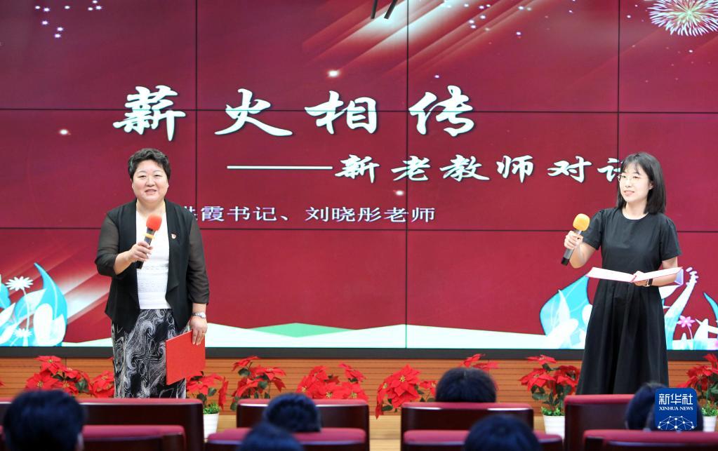9月1日,北京師范大學(xué)實(shí)驗華夏女子中學(xué)的新老教師在開(kāi)學(xué)典禮上以“薪火相傳”為主題對話(huà),并與學(xué)生交流。