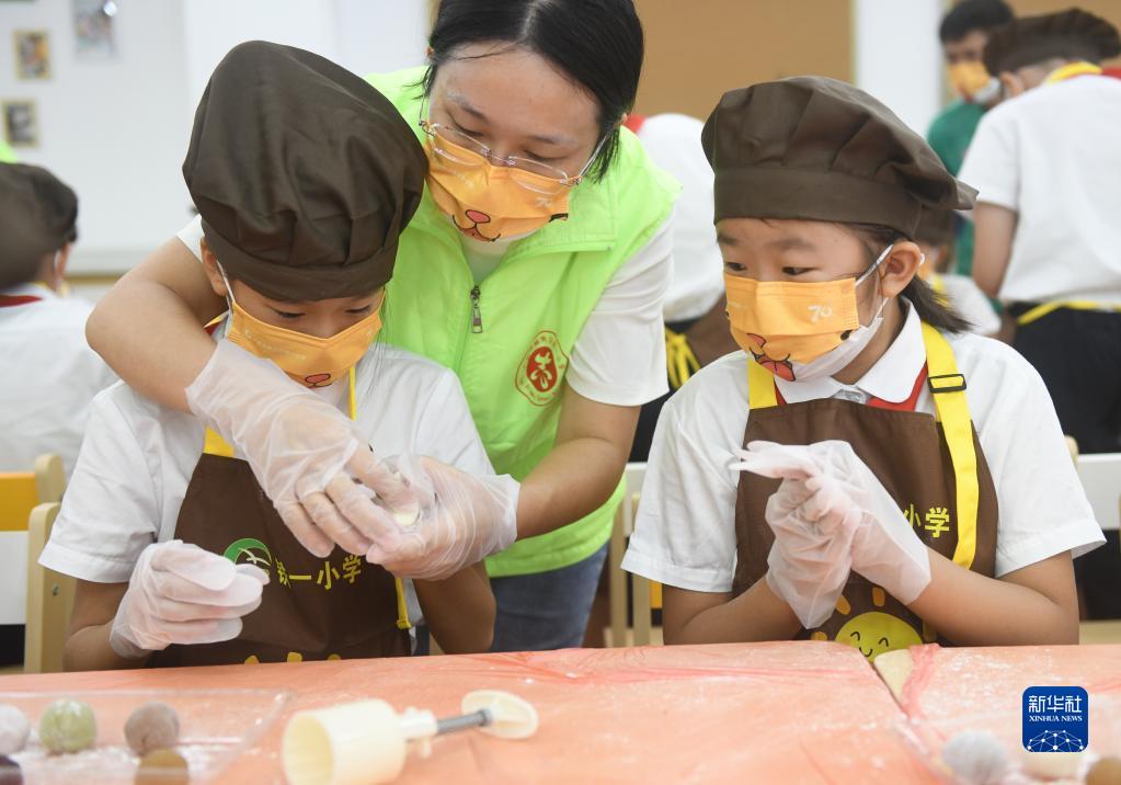9月1日,廣州市鐵一小學(xué)的學(xué)生在勞動(dòng)課上制作月餅。
