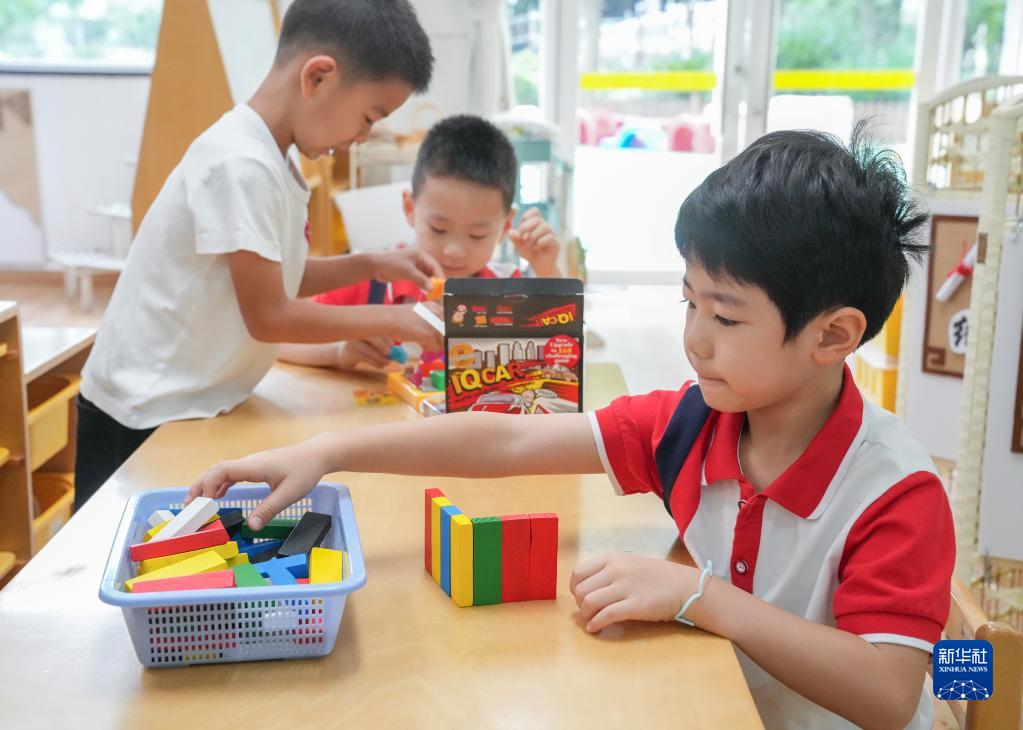 9月1日,在上海市徐匯區科技幼兒園,孩子們在教室內玩玩具。