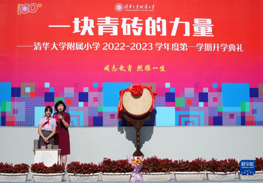 9月1日,在清華大學(xué)附屬小學(xué)開(kāi)學(xué)典禮上,校長(cháng)竇桂梅(右)在給同學(xué)們上開(kāi)學(xué)第一課。