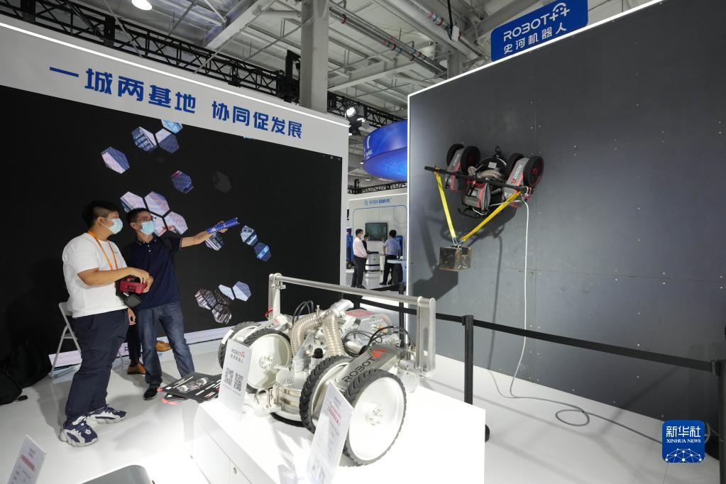 9月1日,在服貿會(huì )首鋼園展區,參觀(guān)者在參觀(guān)一款水射流清理機器人。新華社記者 鞠煥宗 攝