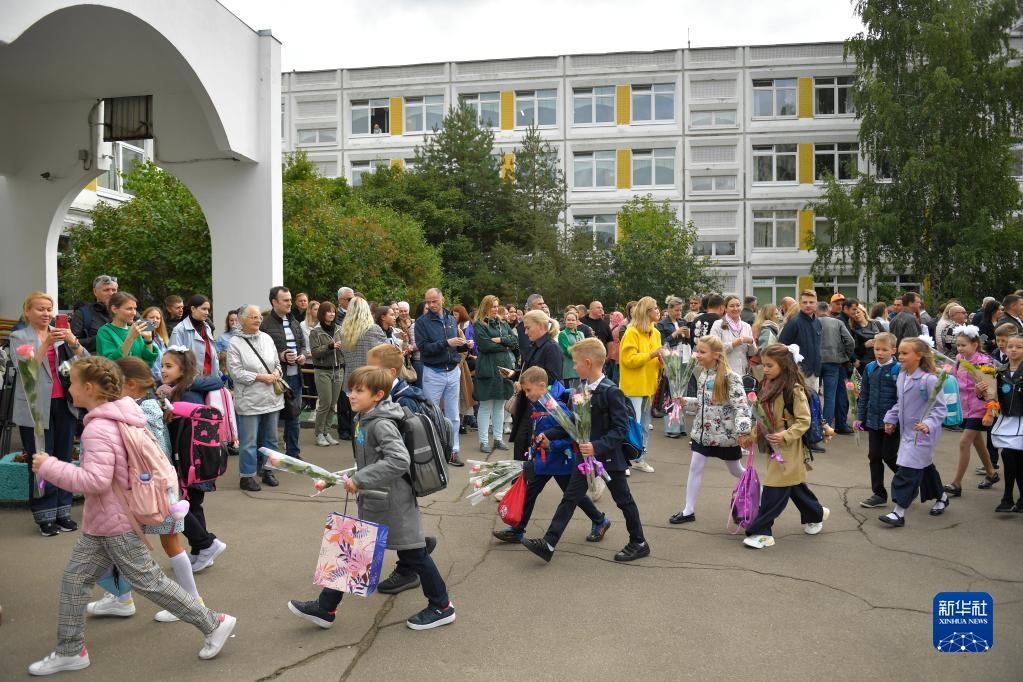 9月1日,在俄羅斯首都莫斯科,學(xué)生們捧著(zhù)花束參加開(kāi)學(xué)典禮。