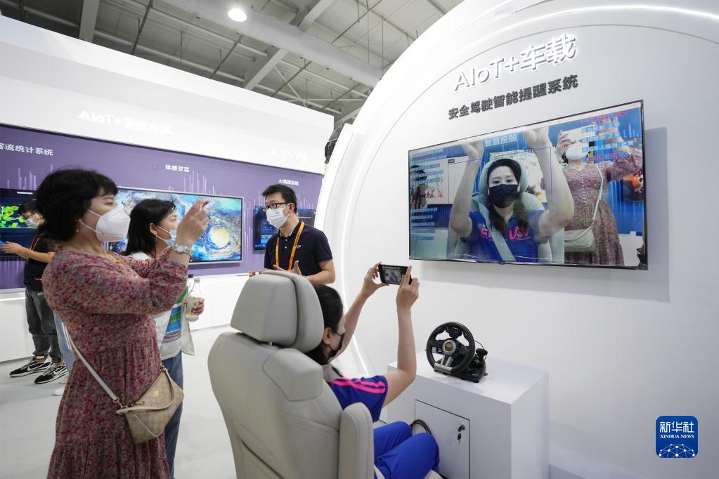 9月1日,在電信、計算機和信息服務(wù)專(zhuān)題展區,參觀(guān)者在體驗一款安全駕駛智能提醒系統。