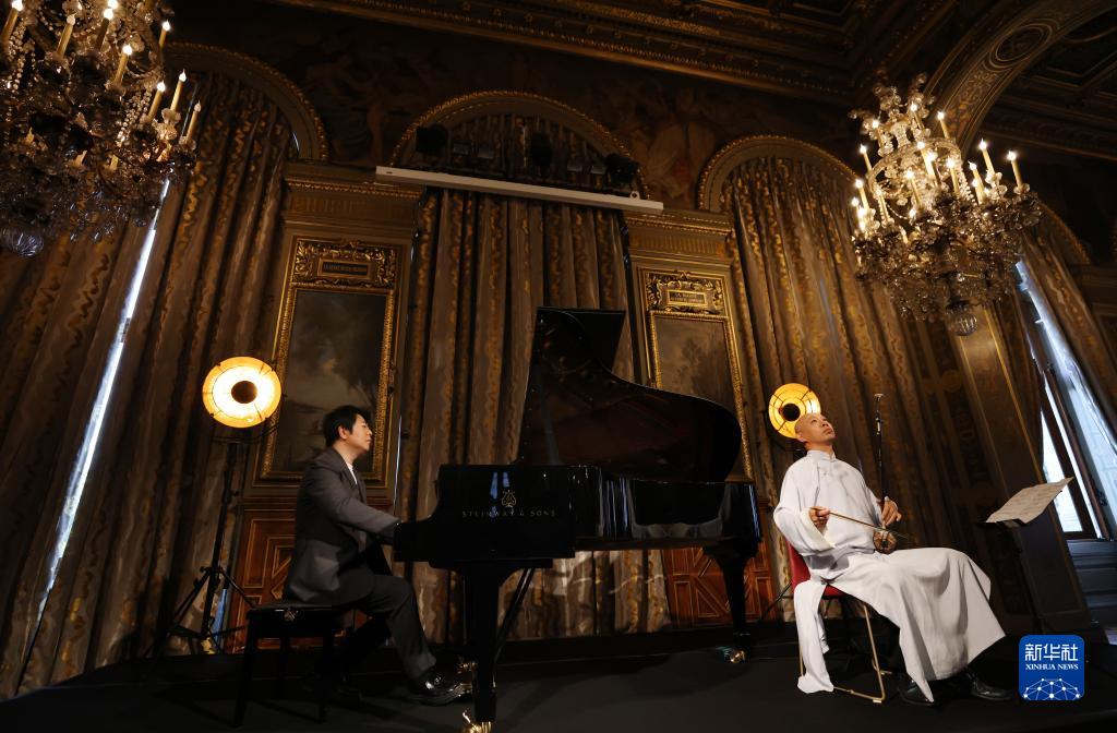 9月1日,郎朗(左)在法國巴黎市政廳舉行的新專(zhuān)輯《郎朗的迪士尼》發(fā)布會(huì )上與二胡演奏家果敢合作演奏。