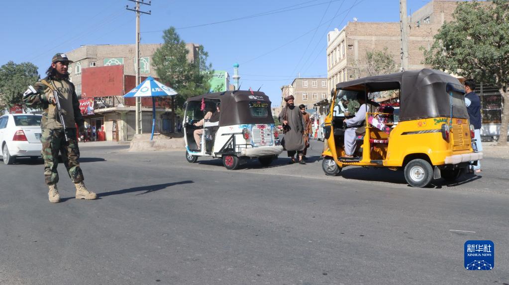 9月2日,在阿富汗赫拉特省發(fā)生爆炸的清真寺附近,安全人員設卡檢查。