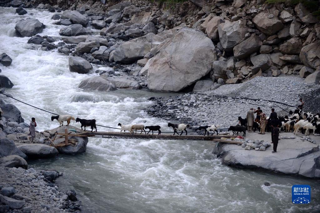 9月1日,在巴基斯坦開(kāi)伯爾-普什圖省斯瓦特地區,牲畜在洪水后通過(guò)一座臨時(shí)搭建的小橋。