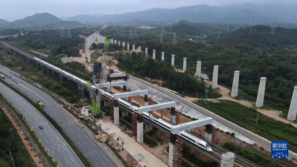 9月3日,一列高鐵列車(chē)經(jīng)過(guò)完成吊裝后的門(mén)式墩鋼蓋梁(無(wú)人機照片)。
