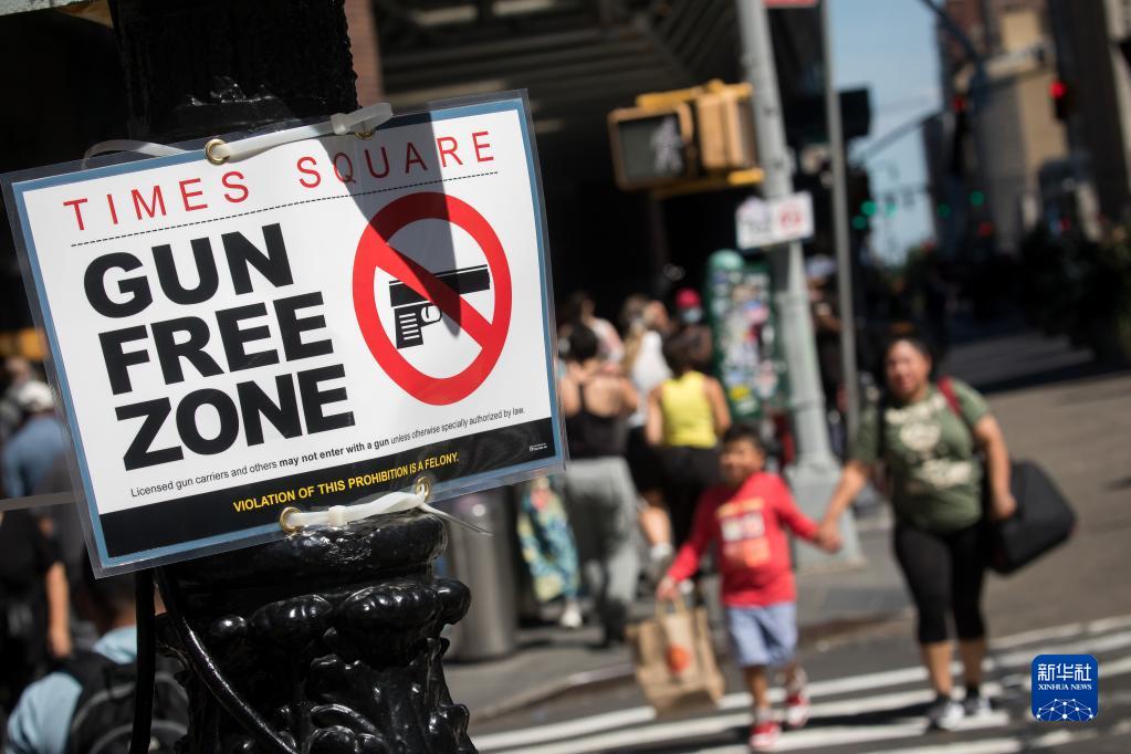 9月1日,人們從美國紐約時(shí)報廣場(chǎng)鄰近街區的“禁槍區”標志牌旁走過(guò)。