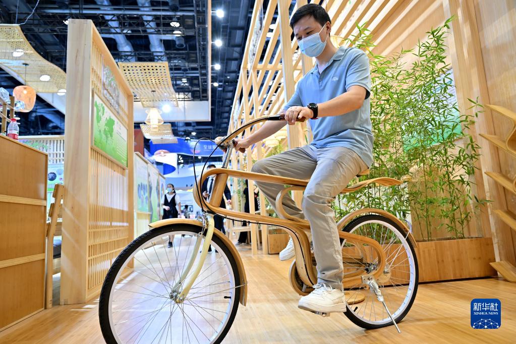 9月3日,觀(guān)眾在體驗一款曲竹單車(chē)。