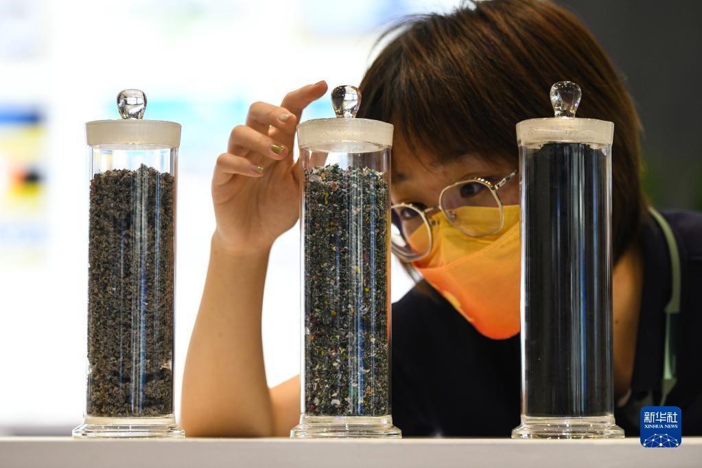 9月3日,在環(huán)境服務(wù)專(zhuān)題展區,觀(guān)眾在參觀(guān)固體回收燃料。