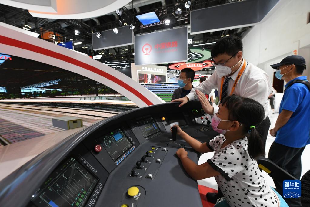 9月3日,小朋友在服貿會(huì )國家會(huì )議中心展館體驗京張高鐵動(dòng)車(chē)組模擬駕駛臺。
