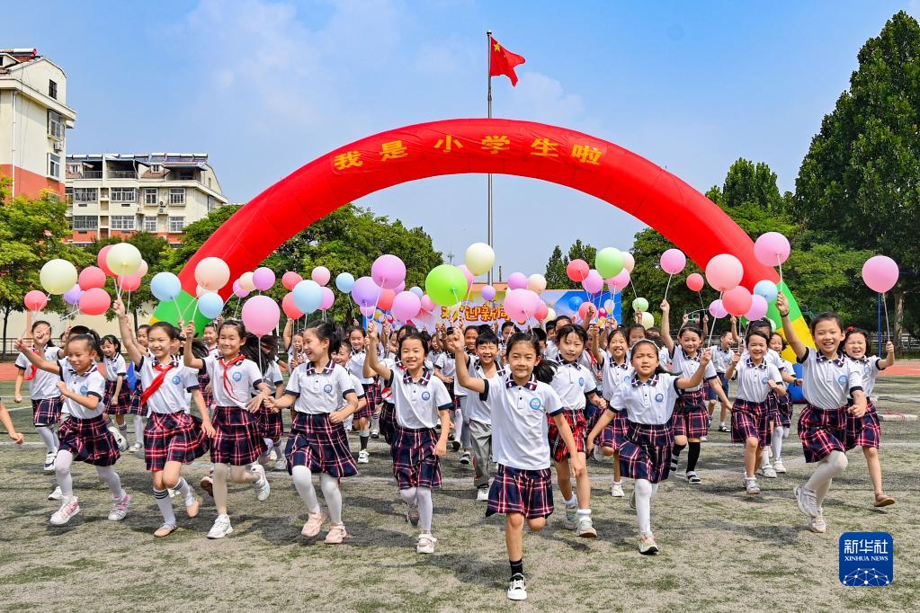 9月1日,山東青州經(jīng)濟開(kāi)發(fā)區小學(xué)學(xué)生手持氣球在操場(chǎng)上奔跑。當日,全國多地中小學(xué)開(kāi)學(xué)。