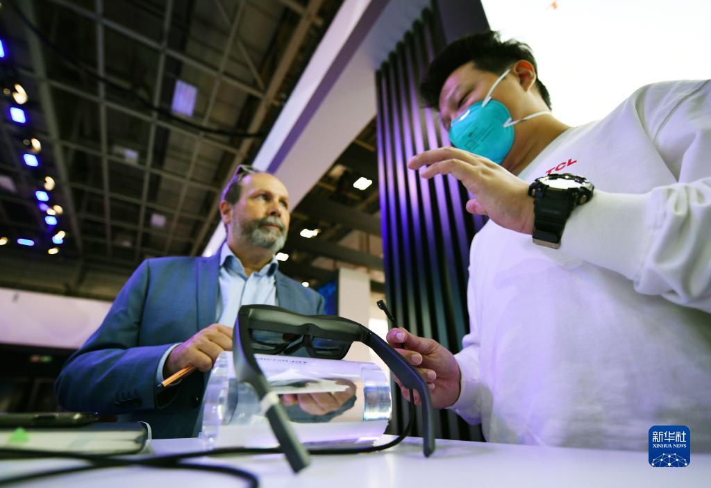 9月2日,在德國柏林國際消費電子展TCL展區,工作人員(右)向參觀(guān)者介紹一款智能穿戴設備。