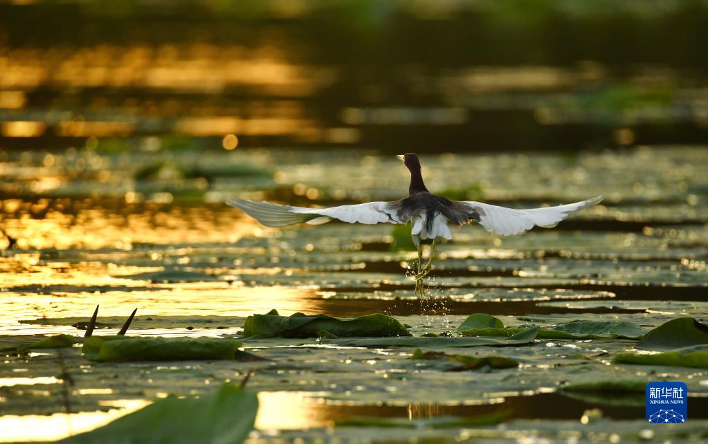 8月23日,在河北省滄縣紙房頭鎮大白洋橋三村的荷園里,水鳥(niǎo)在荷葉間“翩翩起舞”。