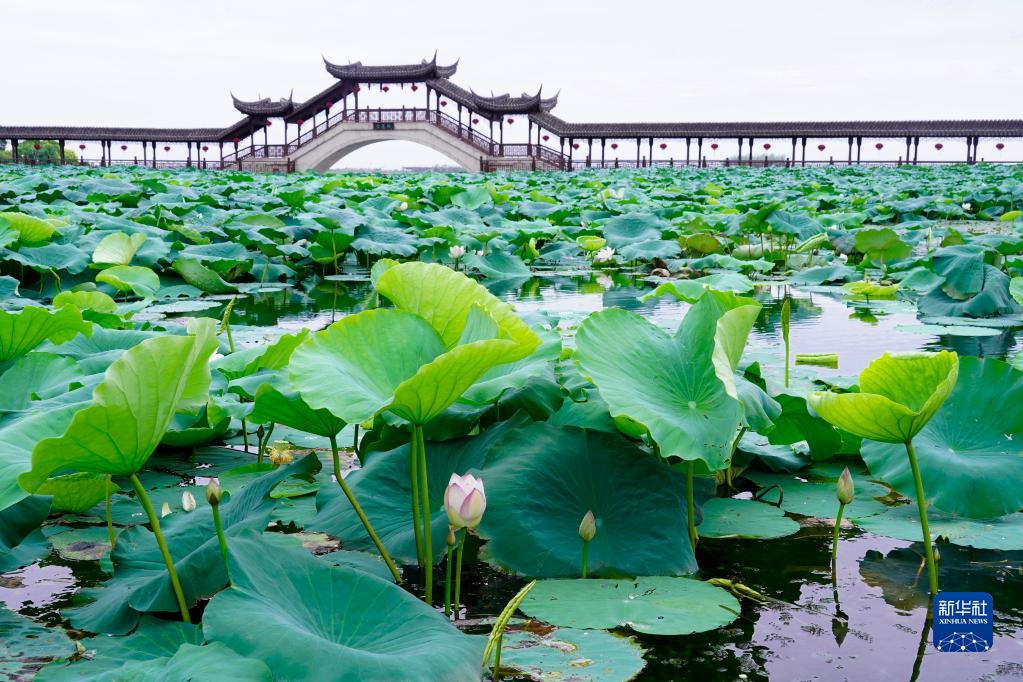 8月28日在江蘇省昆山市錦溪古鎮拍攝的荷塘和古蓮橋。