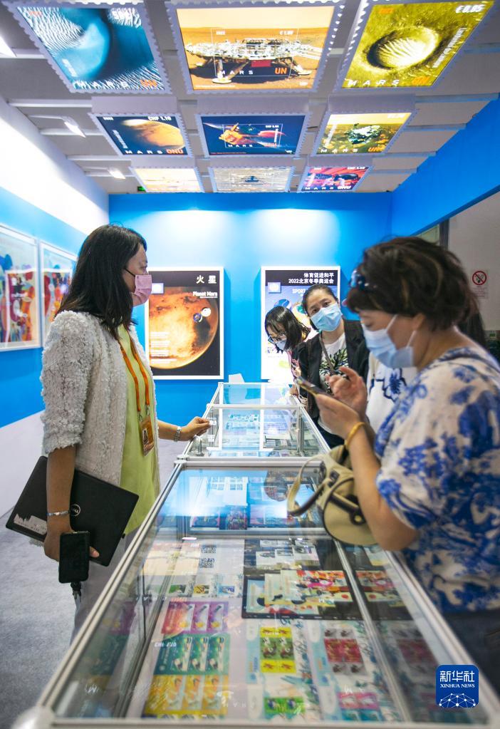 9月3日,參展商在服貿會(huì )國家會(huì )議中心展館聯(lián)合國郵政管理局展臺為參觀(guān)者介紹郵票。