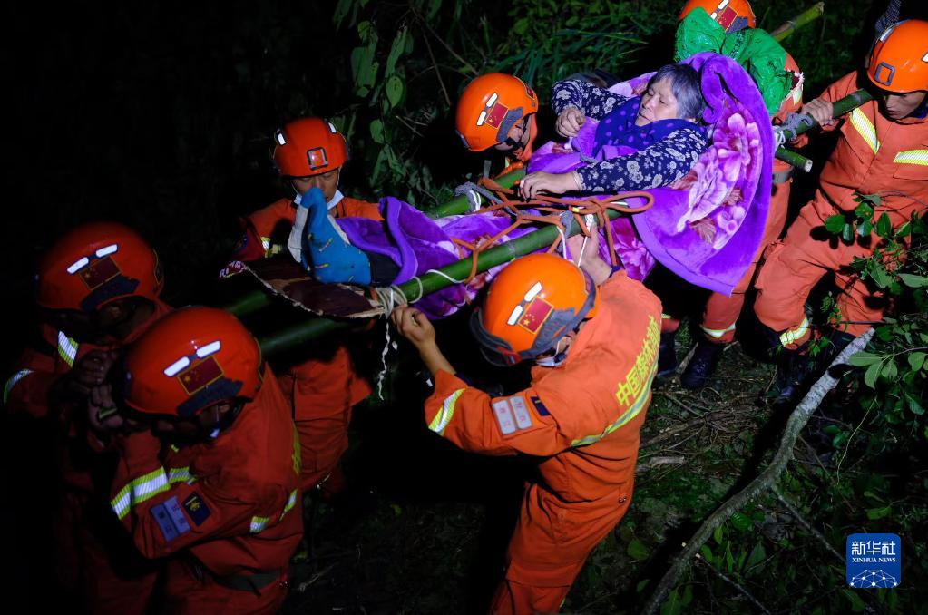9月5日,四川森林消防總隊甘孜支隊消防員在瀘定縣磨西鎮青崗坪村轉移傷員。