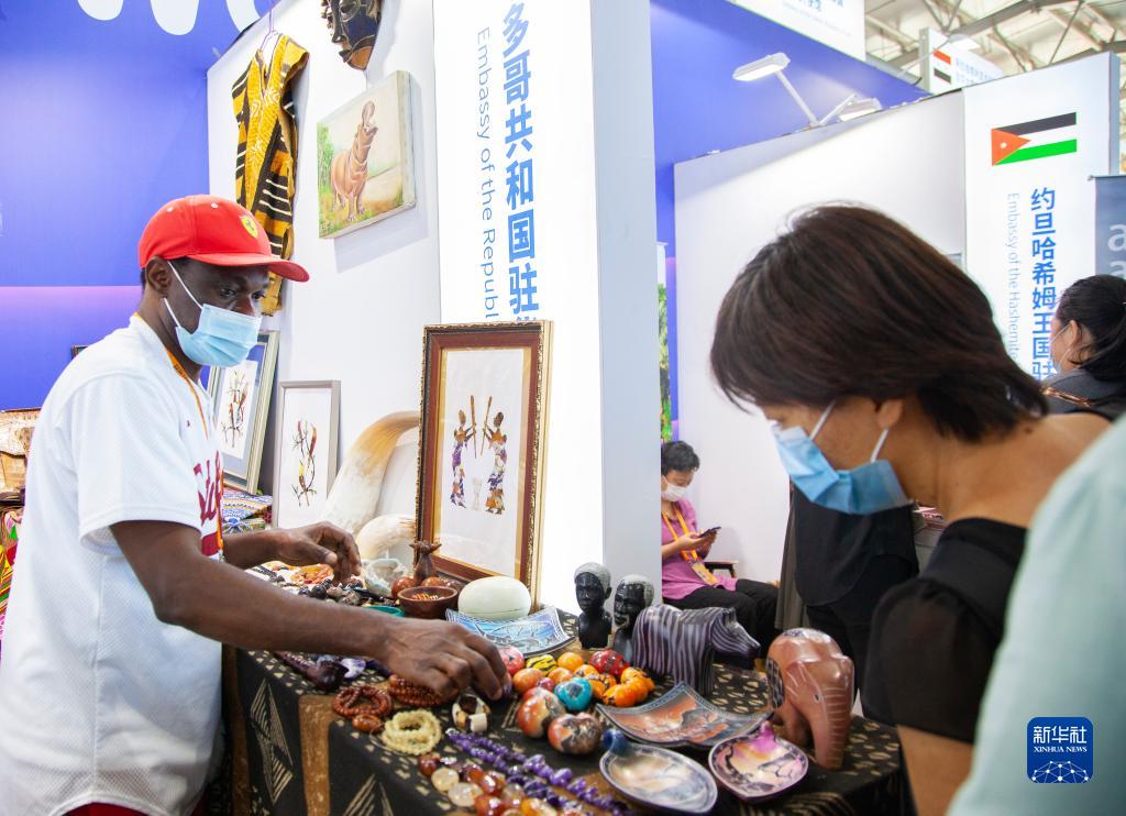 9月5日,觀(guān)眾在服貿會(huì )首鋼園區文旅服務(wù)專(zhuān)題展區多哥展臺挑選商品。