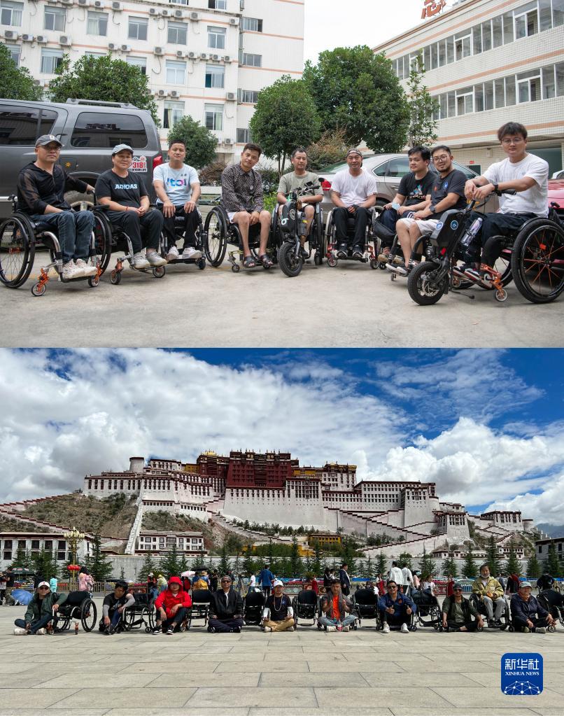 拼版照片:上圖為7月16日,在成都“泉心健康之家生活重建訓練營(yíng)”,何鵬(右二)與輪友們在“川藏線(xiàn)”自駕出發(fā)前合影(新華社記者 胥冰潔 攝);下圖為7月30日,何鵬(左五)與輪友們在布達拉宮前合影(受訪(fǎng)者供圖)。