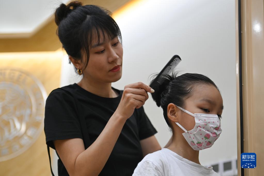 8月29日,在北京市海淀區,錄制歌曲前化妝師為淼淼(化名)梳理頭發(fā)。