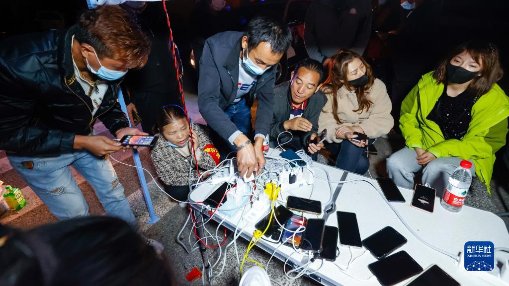 9月5日晚,在四川甘孜州瀘定縣磨西鎮的受災群眾臨時(shí)安置點(diǎn),人們在中國電信便民服務(wù)點(diǎn)為手機充電。