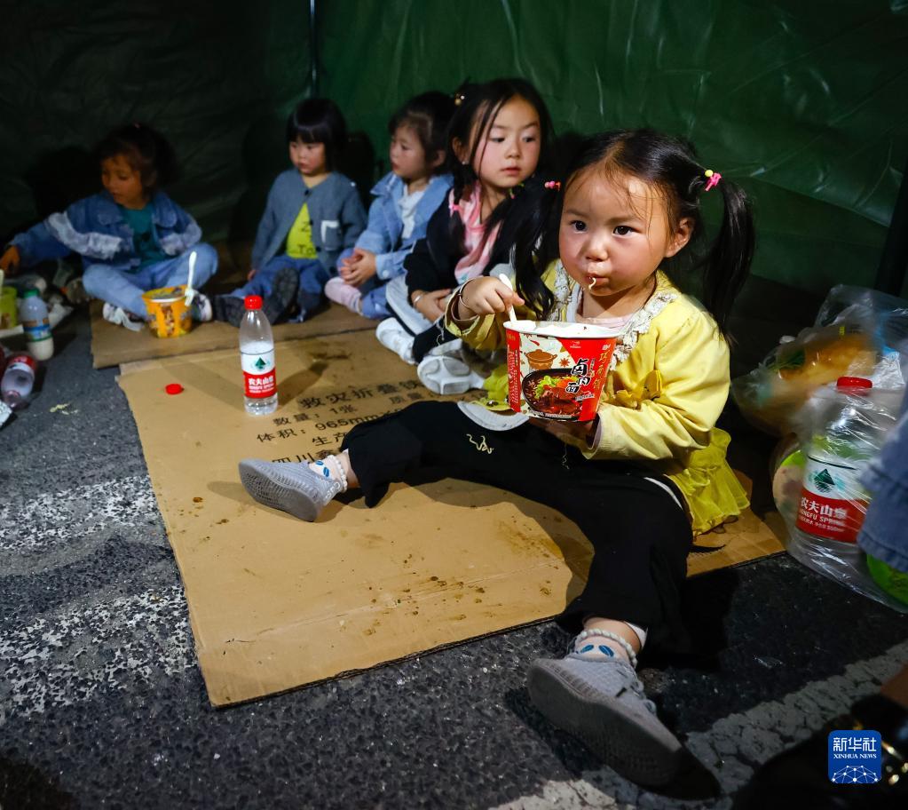 9月5日晚,在四川甘孜州瀘定縣磨西鎮的受災群眾臨時(shí)安置點(diǎn),幾個(gè)家庭的孩子們在一個(gè)帳篷里吃飯、休息。